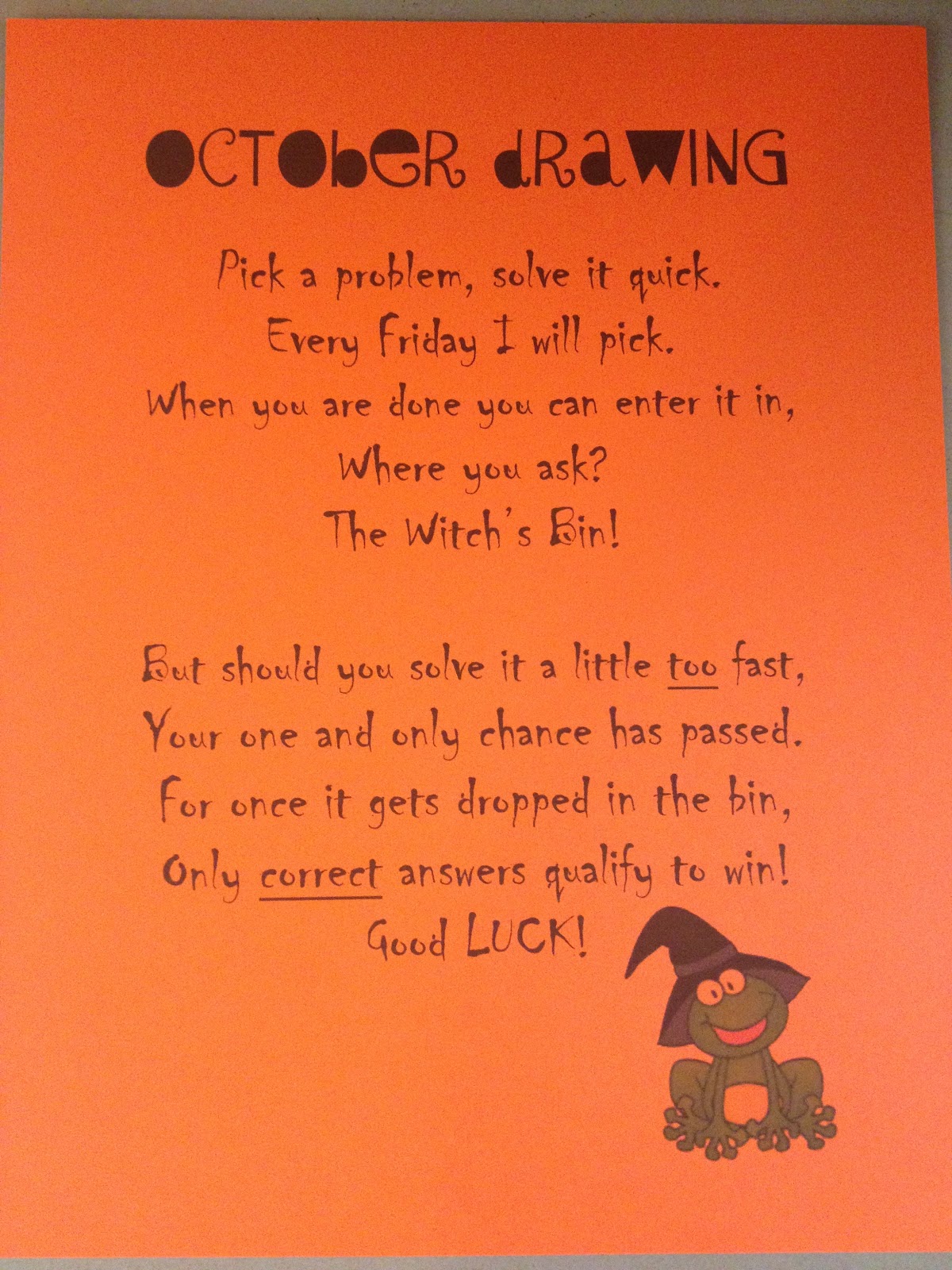 上周五未选中的名称进入一个更大的绘图,将发生在万圣节。我还没有想出我的大奖会是怎样,但这些每周图纸保持孩子从事和兴奋。你做什么工作纳入假期/季节,同时仍保持它的教育?