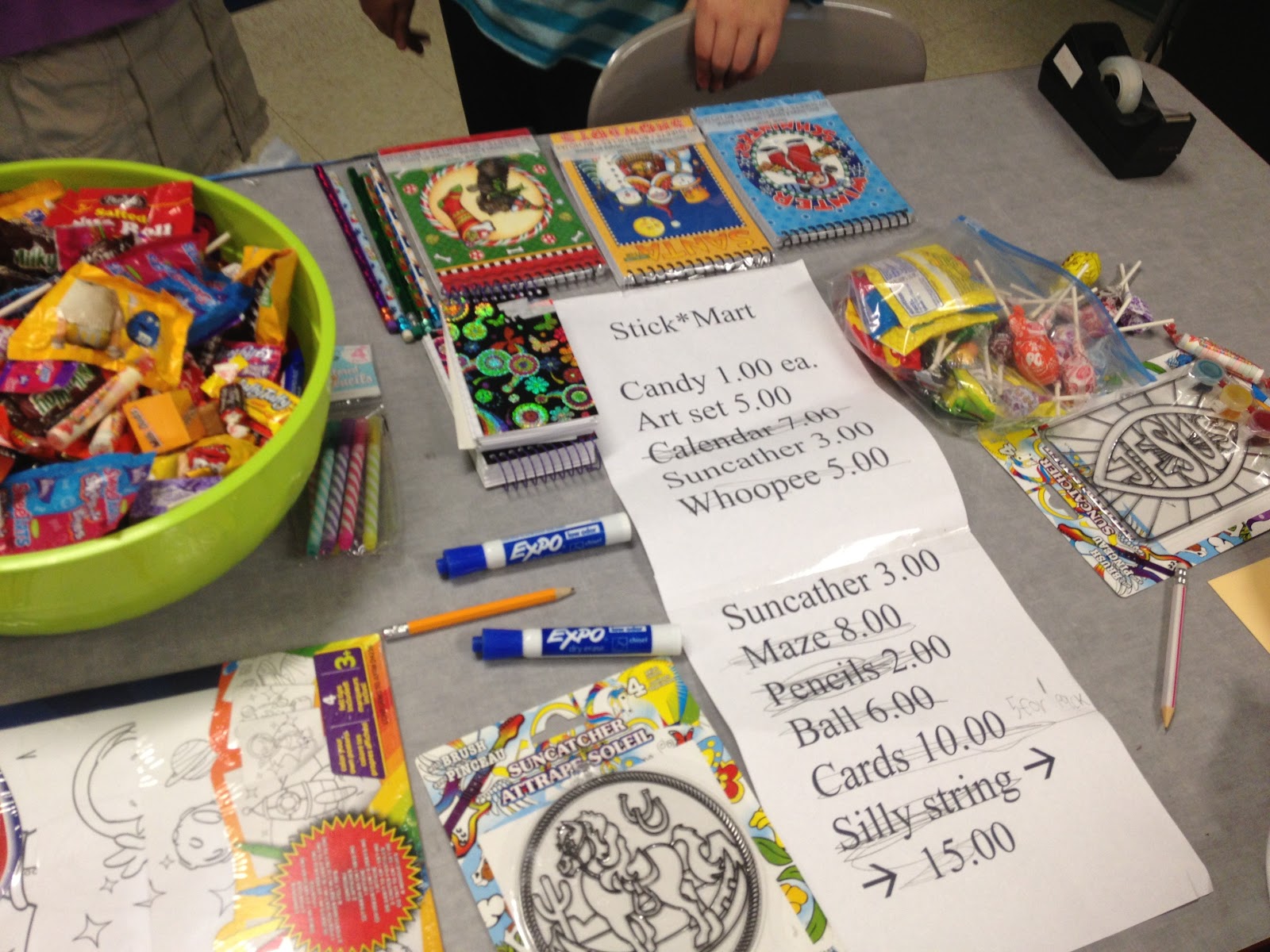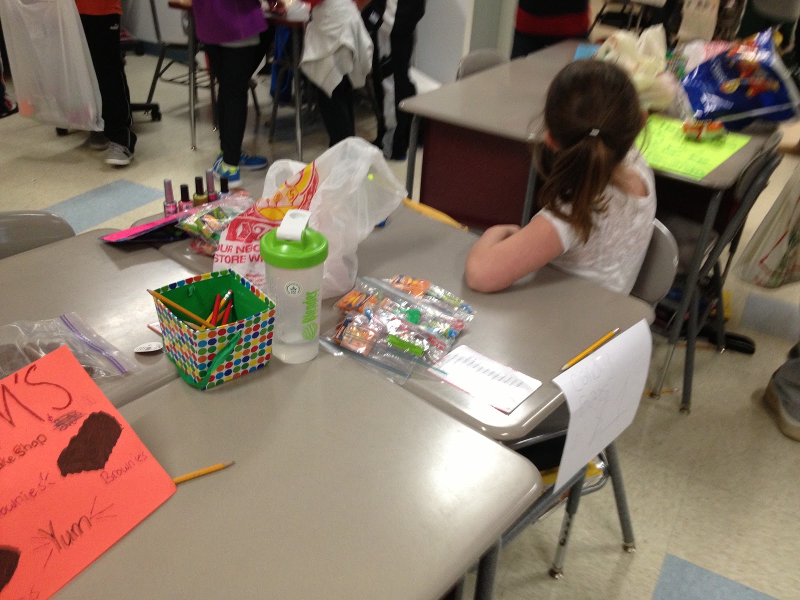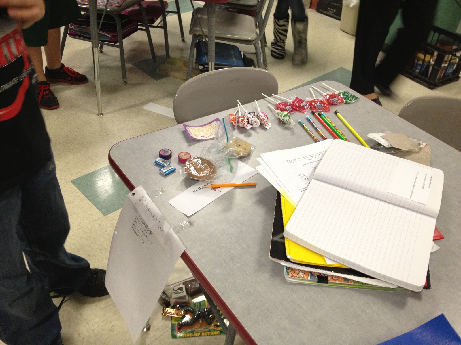 刚刚过去的这个星期五标志着我们10周的标记时段的结束。我们有我们的第一个交换节。交换日是学生都省下自己的钱一天。每个学生,使一类商店和销售的东西。They can sell old toys, tchotchke, nail polish, dollar store *stuff*, candy, crafts, rocks, baked goods, trading cards, etc. My classroom connects to our math teacher’s classroom with a dividing wall, so we open up the room and allow the students to set up shop between our two rooms so the students can see all of the different stores and easily shop at each one. Swap Day was SO fun! The students made withdrawals from their bank accounts to shop and they left with grocery bags full of *stuff* (sorry, parents…)