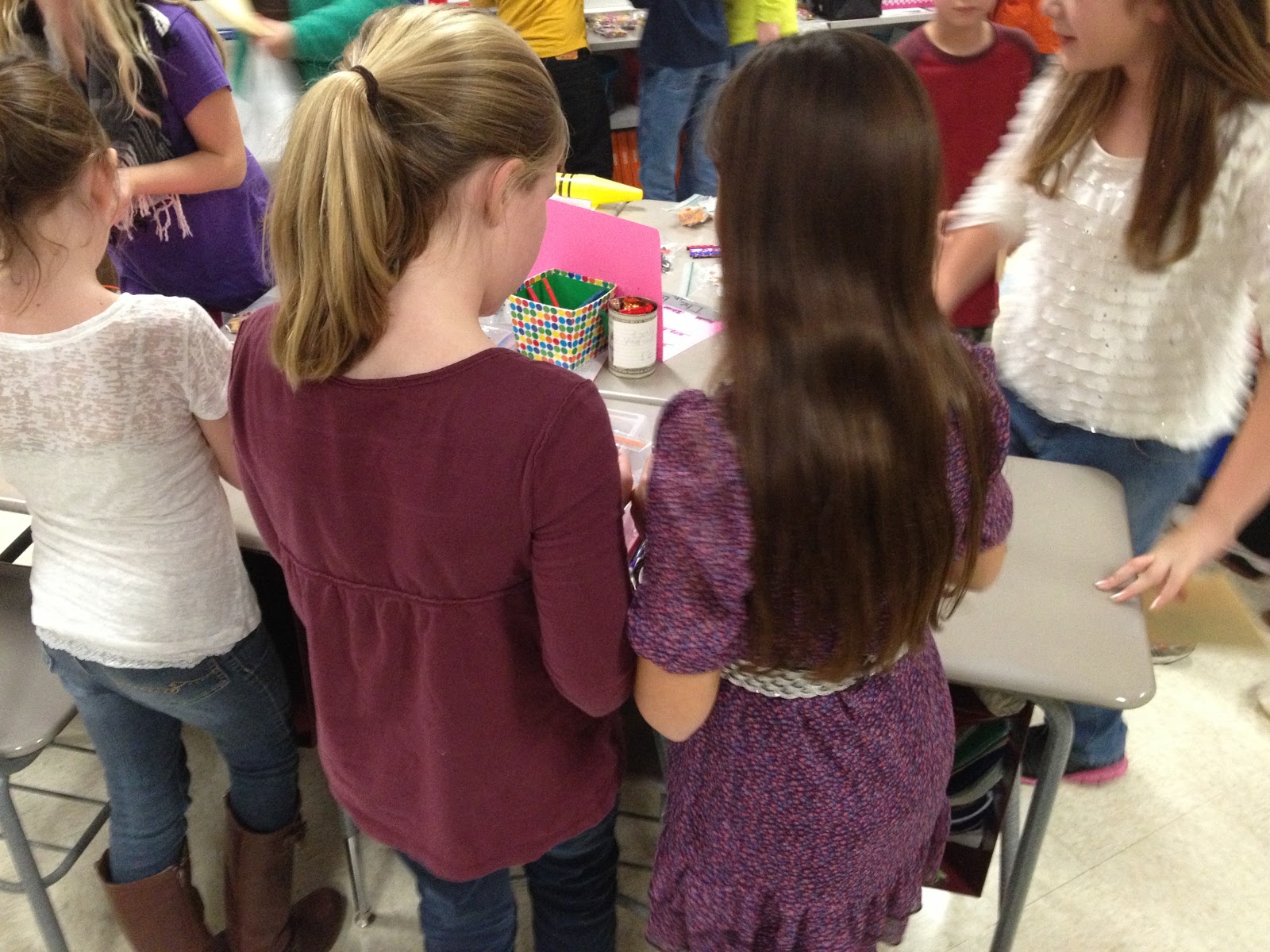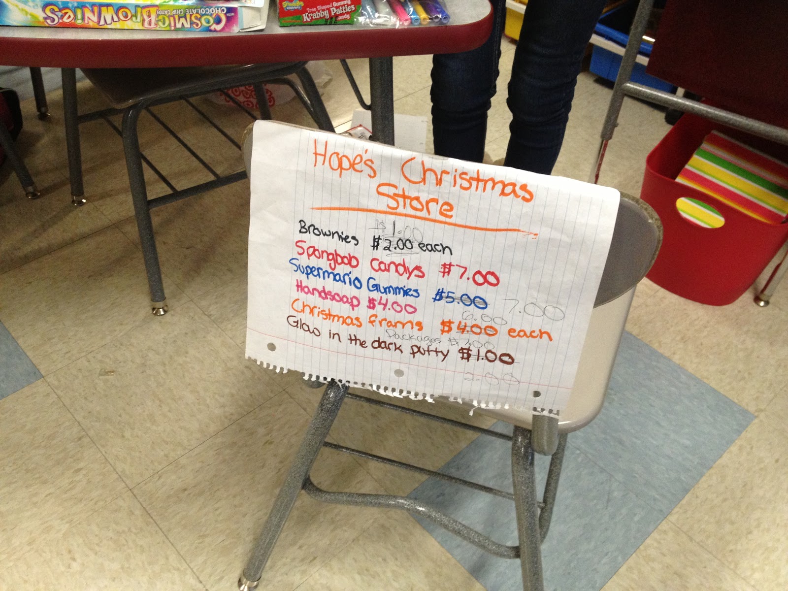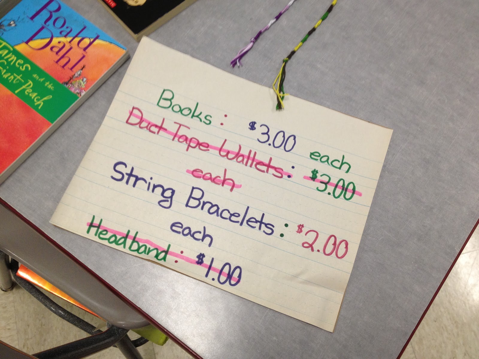 刚刚过去的这个星期五标志着我们10周的标记时段的结束。我们有我们的第一个交换节。交换日是学生都省下自己的钱一天。每个学生,使一类商店和销售的东西。They can sell old toys, tchotchke, nail polish, dollar store *stuff*, candy, crafts, rocks, baked goods, trading cards, etc. My classroom connects to our math teacher’s classroom with a dividing wall, so we open up the room and allow the students to set up shop between our two rooms so the students can see all of the different stores and easily shop at each one. Swap Day was SO fun! The students made withdrawals from their bank accounts to shop and they left with grocery bags full of *stuff* (sorry, parents…)