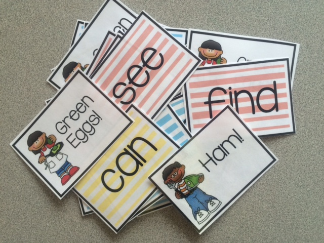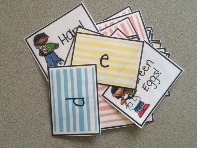 我的孩子们发疯这个简单的纸牌游戏。我们每一个单元中发挥不同的版本的它。这是很简单的。选择一个卡,读卡,守卡。如果你画绿鸡蛋或火腿,你失去所有的卡片!我喜欢有多个版本,因为我的孩子们都在不同的层次。我们用字母,声音,视线的话和废话玩文字游戏。