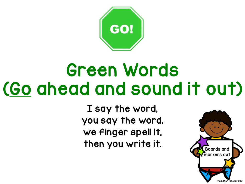 “Go”是学生们被鼓励去“Go ahead and sound it out”的单词。它们是按发音拼写的单词,也可以用手指拼写。学生们拿出干擦板和橡皮。